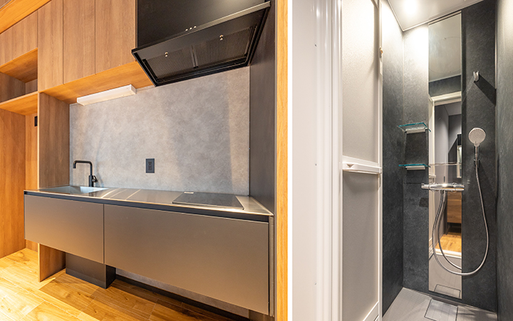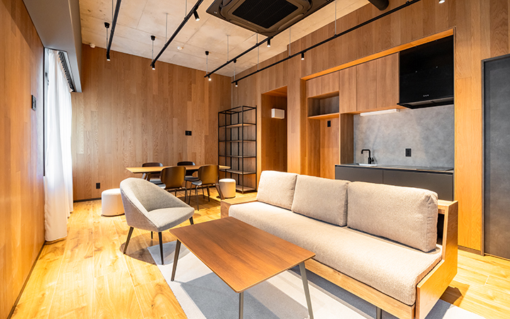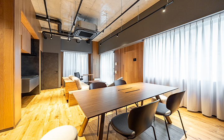 1~5名での利用を想定したワークスペース。1F共有ラウンジの会議室を有料で利用が可能です。