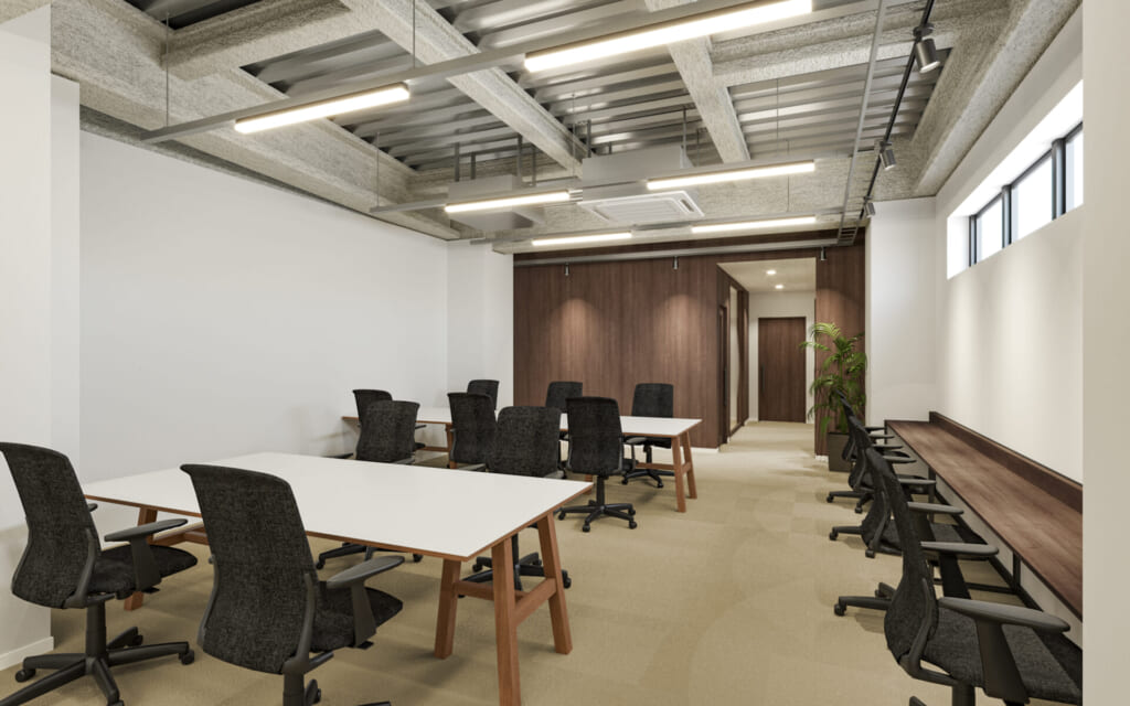 30名程の席が設置できるワークスペース。ワークスペースは家具あり(ワークデスク・チェア+WEBブース)と家具無かを選択できます