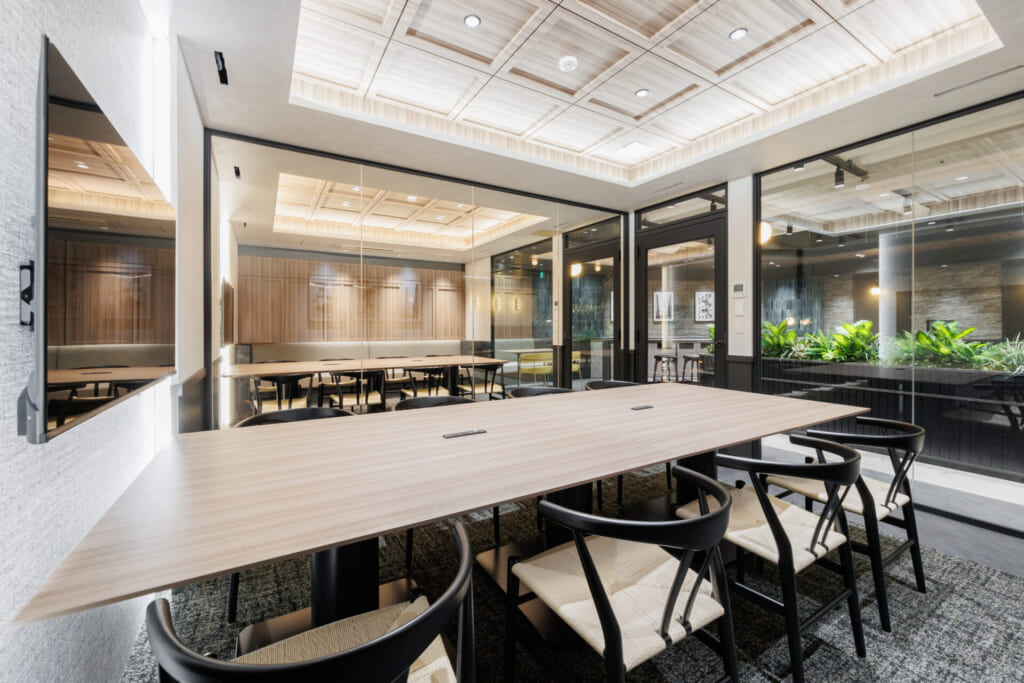 高級感のある内装と、共有ラウンジ・専用テラス付きのセットアップオフィス